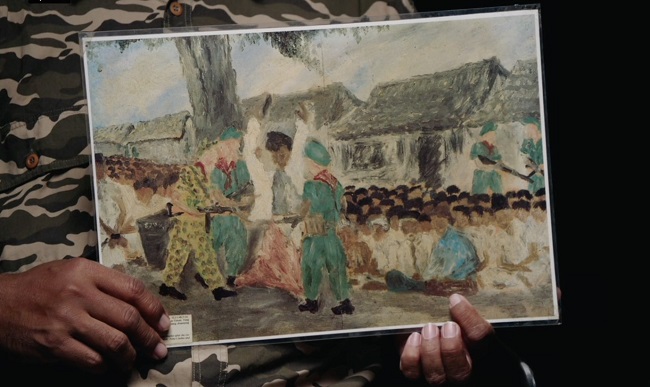 During the interview, Lexy asked Kurniawan about the paintings, one of which pictured Dutch soldiers searching Toha’s house looking for his brother who became a guerrilla. 'Kurniawan said that, although he is aware of this story, his dad always mentioned the arrest of his grandfather, Toha’s father, instead. In the painting it is the man wearing a blue surjan. A traditional Javanese attire for men.'