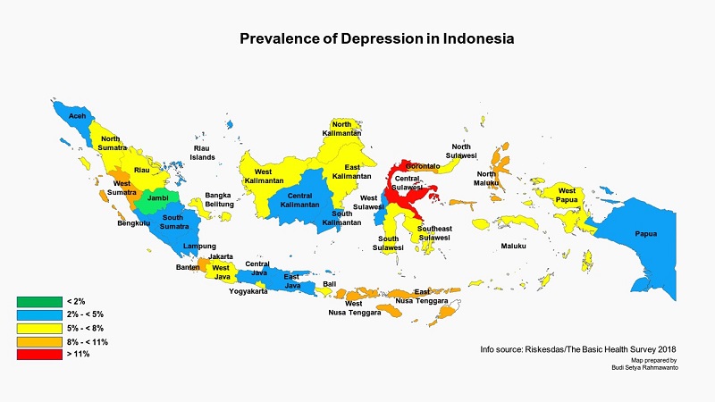 The most recent and reliable estimate of the prevalence of depression in Indonesia comes from the Riskesdas Basic Health Survey published in 2018. It suggests that 6.1 per cent of a population representative sample or over 163,000 Indonesians are suffering from depression, as opposed to 9.8 per cent of the same sample who are suffering from more generalised emotional distress (this number includes those suffering from depression, anxiety, and other related disorders). Independent of how prospective patients present themselves to clinicians, the prevalence of depression symptoms among Indonesians is consistent with global averages.