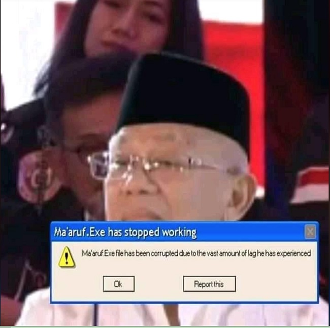 The meme’s creator intended to illustrate Ma'ruf Amin 's underperformance in the first of the 2019 presidential election debates. During the debate, Ma'ruf Amin hardly said a word. He did not present a speech, nor did he respond to rival candidates. The meme represents Ma'ruf Amin's performance in the debate as a computer glitch.